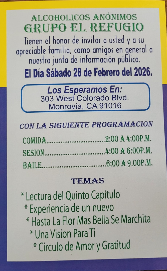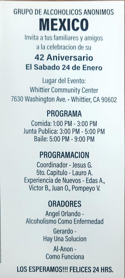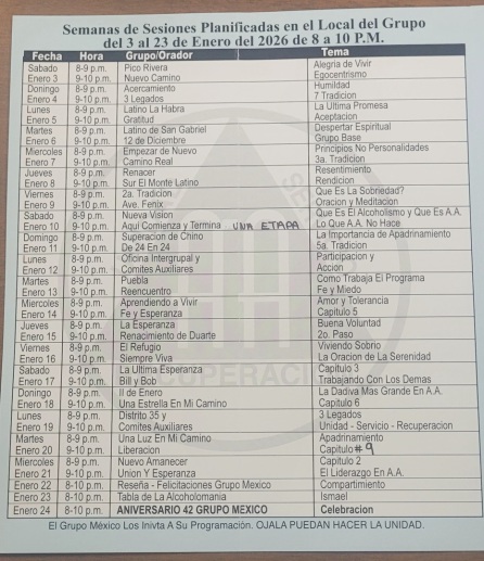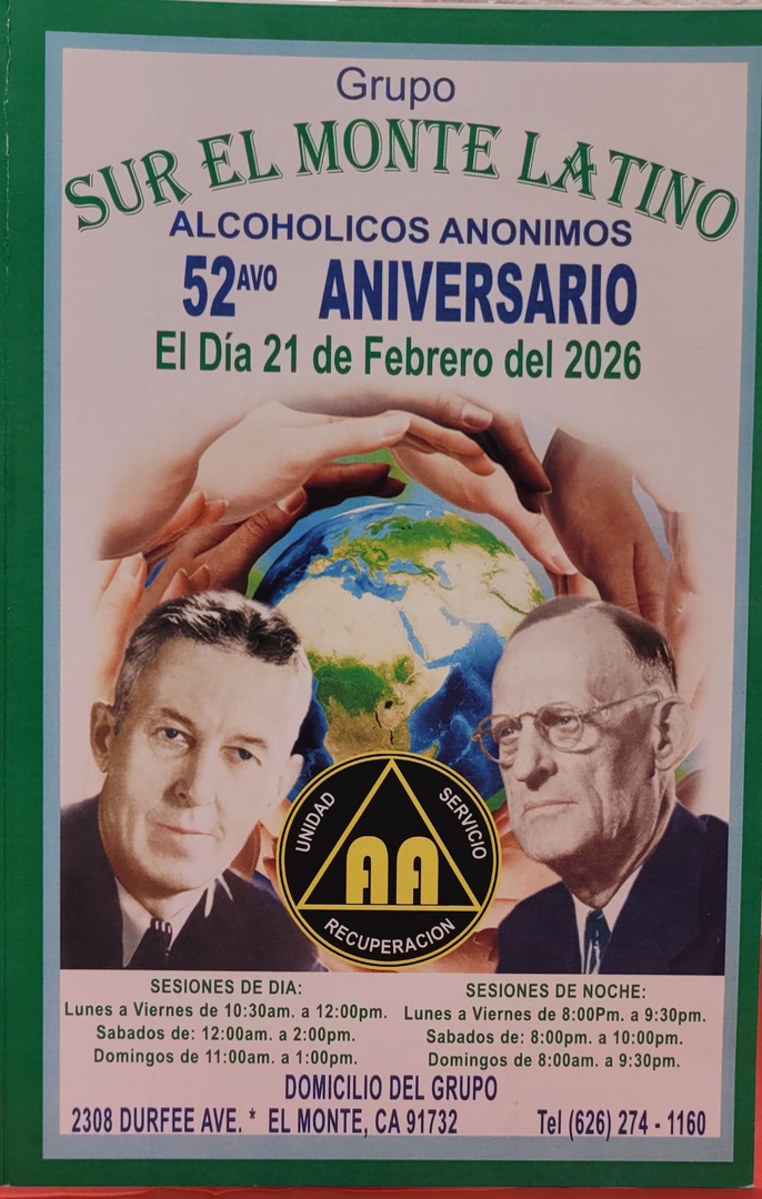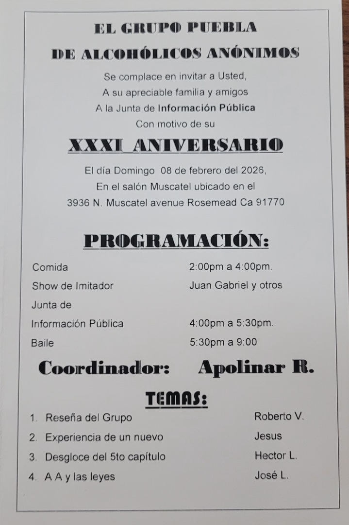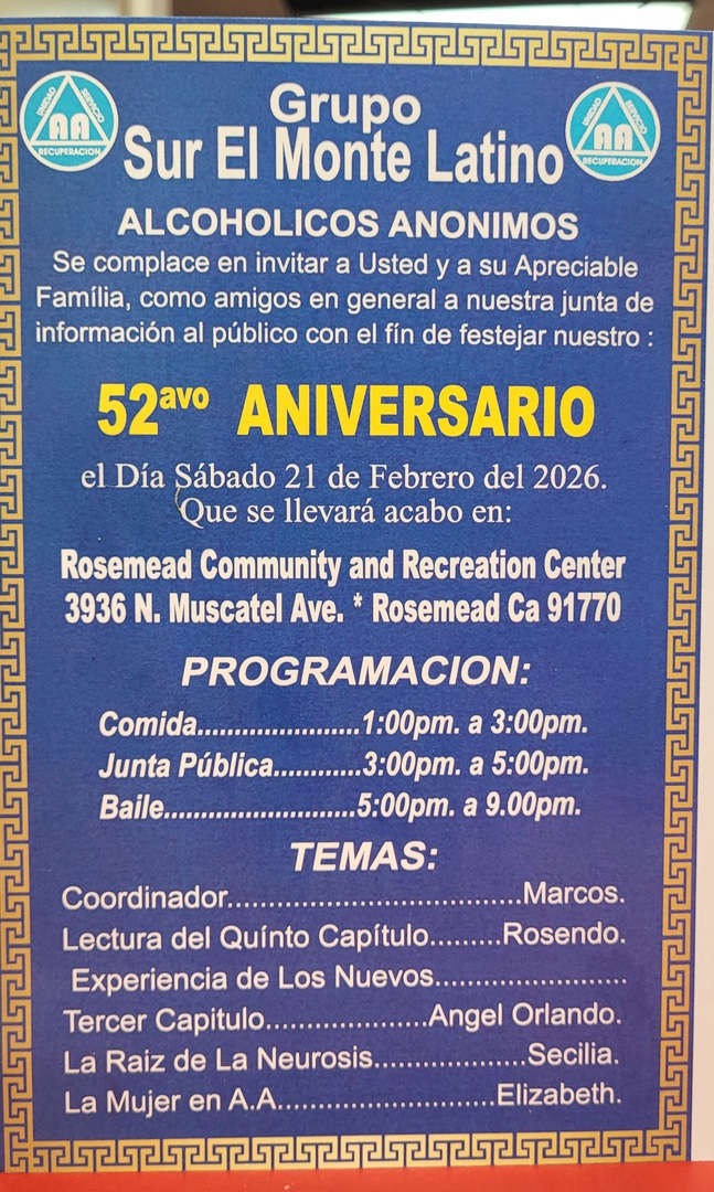 El compañero Raúl dará testimonio de su Décimo aniversario. El sábado 24 de enero 2026. Están todos invitados. En el grupo sur el monte latino. Abra un convivió de 7 a 8 pm y de 8 a 10 las felicitationes.